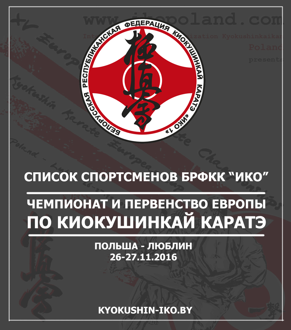 26-27 ноября 2016 г. в г. Люблине (Польша), пройдет очередное Первенство и Абсолютный Чемпионат Европы по Киокушинкай каратэ. На турнир было заявлено 25 спортсменов БРФКК "ИКО 1":