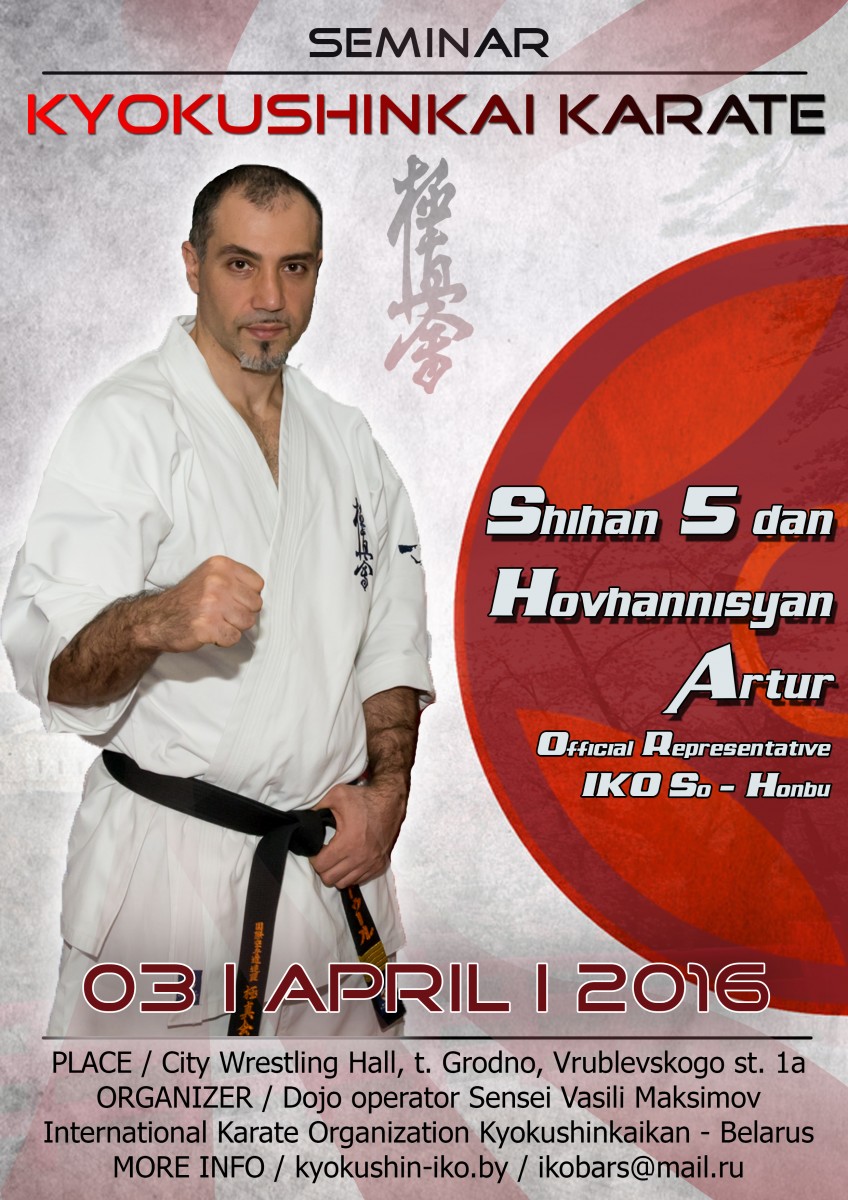 1-3 апреля 2016 года в Гродненском городском спортивном комплексе состоится 4 Открытое первенство и Чемпионат Беларуси по Киокушинкай карате (ИКО) среди детей, юношей и девушек, юниоров и юниорок, мужчин и женщин в разделе кумите.